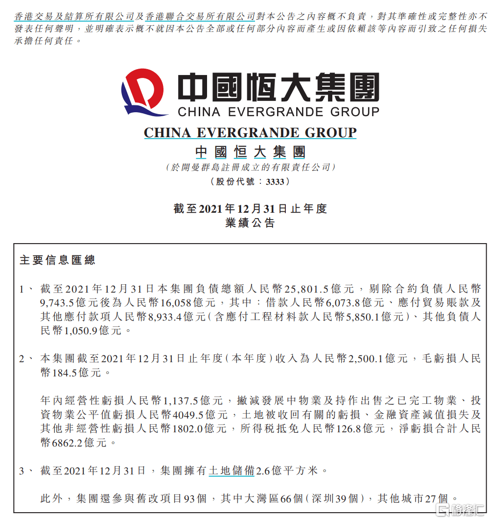 2021年12月31日年度业绩公告显示,实现收入为2500.1亿元,毛利亏损184.5亿元;年内经营性亏损1137.5亿元,撇减发展中物业及持作出售之已完工物业、投资物业公平值亏损4049.5亿元,土地被收回有关的亏损、金融资产减值损失及其他非经营性亏损1802.0亿元,所得税抵免126.8亿元,2021年净亏损合计6862.2亿元。