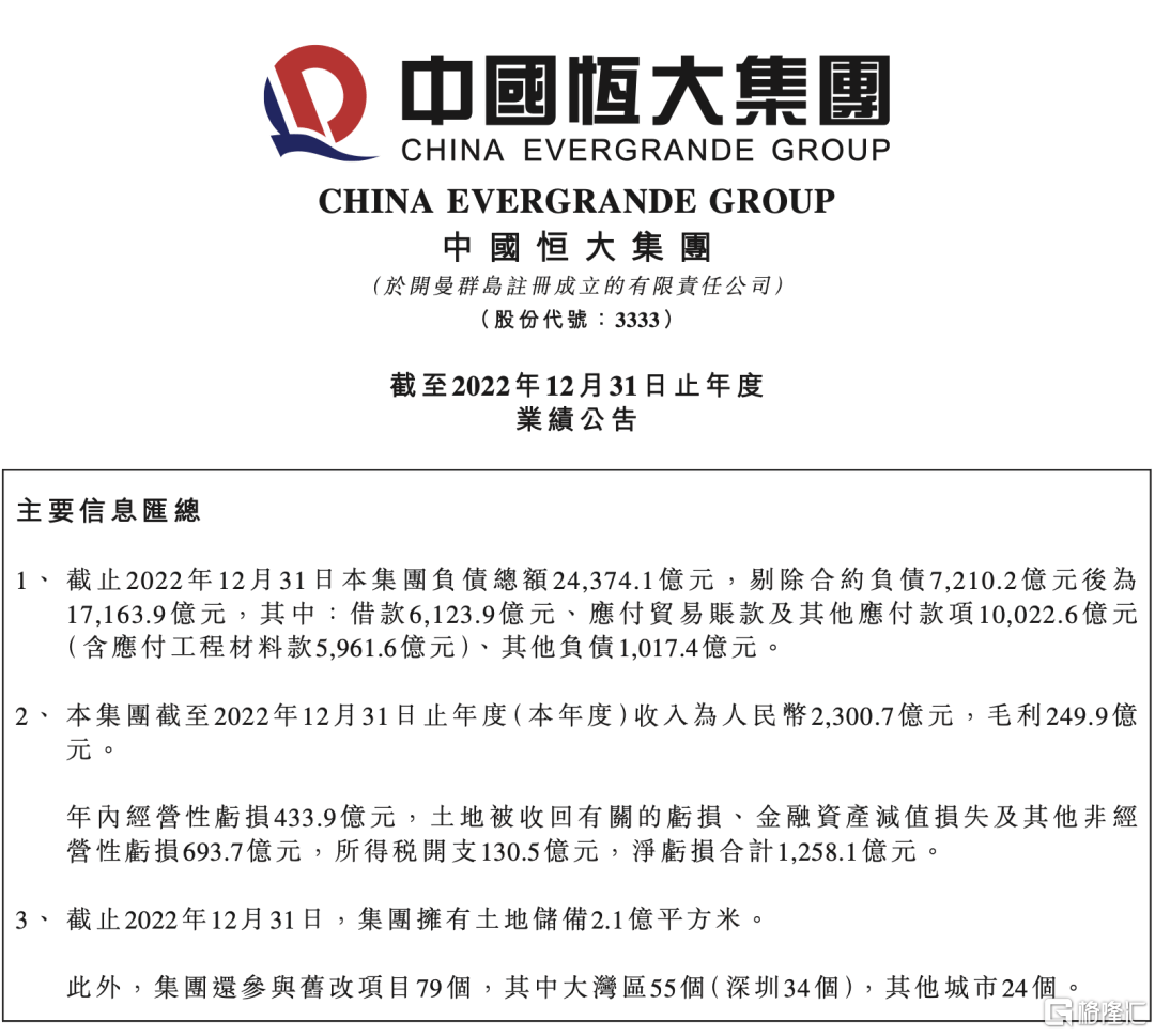 2022年12月31日年度业绩公告显示,收入为2300.7亿元,毛利249.9亿元;年内经营性亏损433.9亿元,土地被收回有关的亏损、金融资产减值损失及其他非经营性亏损693.7亿元,所得税开支130.5亿元,净亏损合计1258.1亿元。