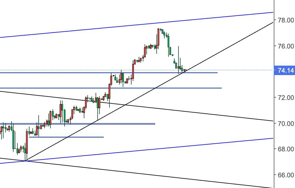 上方短期先关注昨天美盘反弹的高点75.1/75.2以及昨天欧盘反弹的高点76附近阻力。如果继续强势走高,那么短期调整可能结束,上方则进一步关注前高77.3以及5月4日以来高低点连线形成的上涨通道目前位于78/78.1附近阻力。
