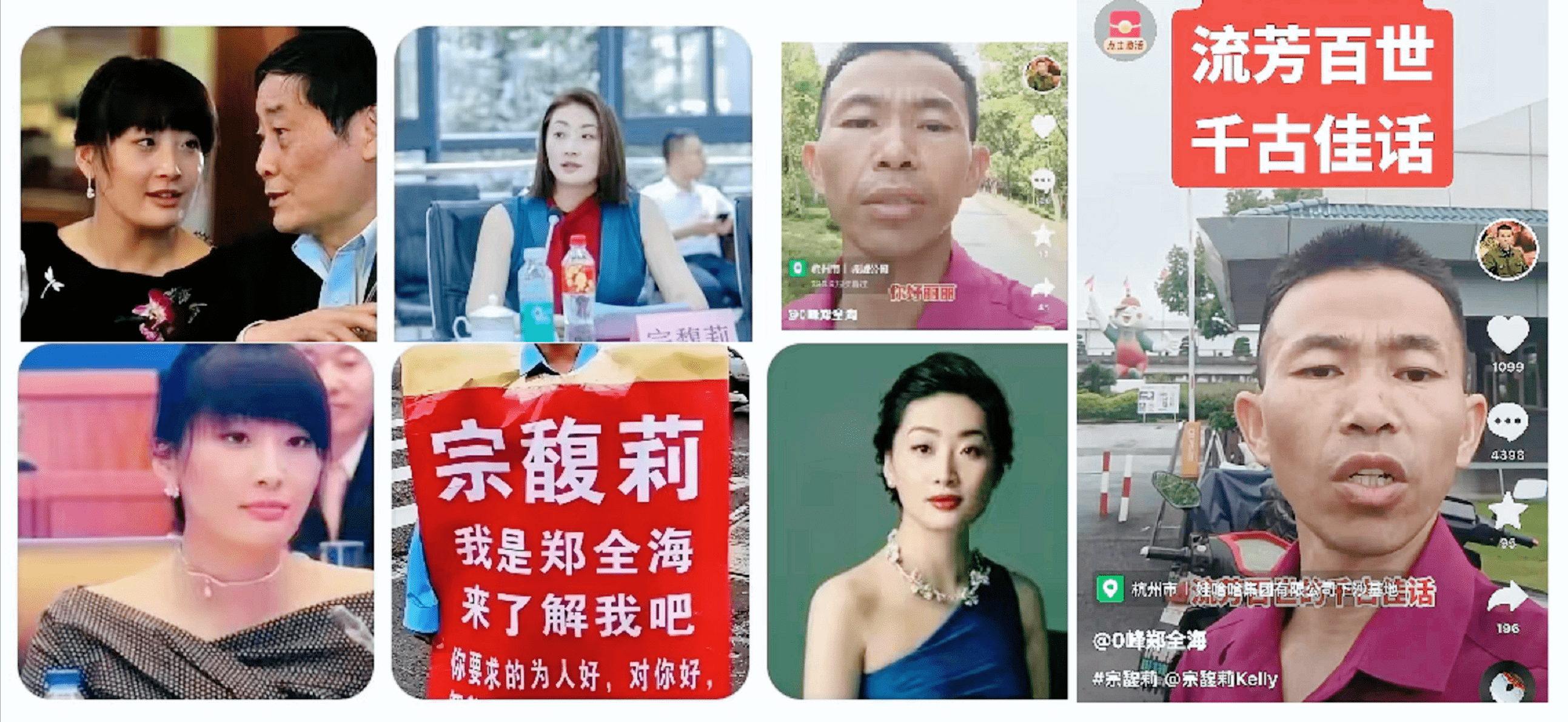 在求婚的初期阶段,郑全海身穿印有宗馥莉名字的大字报,这是他对外界的明确展示。他的开场白是:“你好宗馥莉,我是郑全海…”