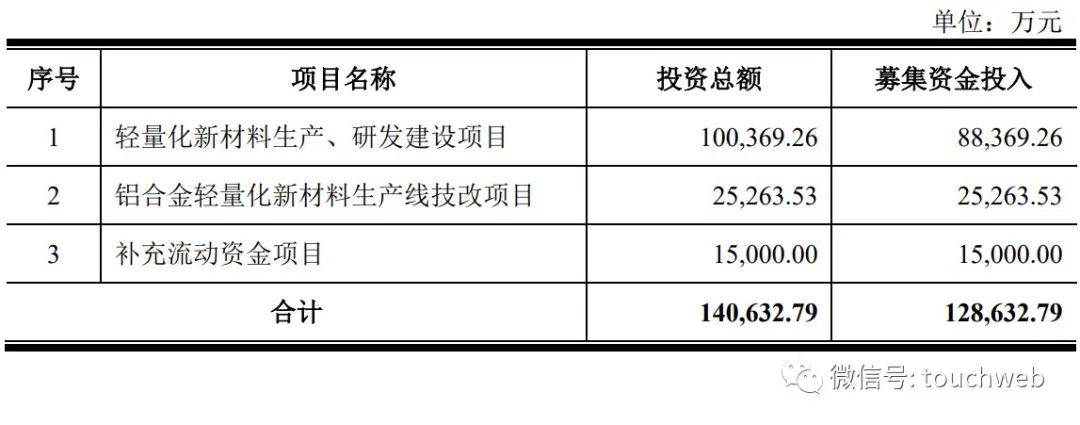 其中,8.84亿元用于轻量化新材料生产、研发建设项目,2.53亿元用于铝合金轻量化新材料生产线技改项目,1.5亿元用于补充流动资金项目。