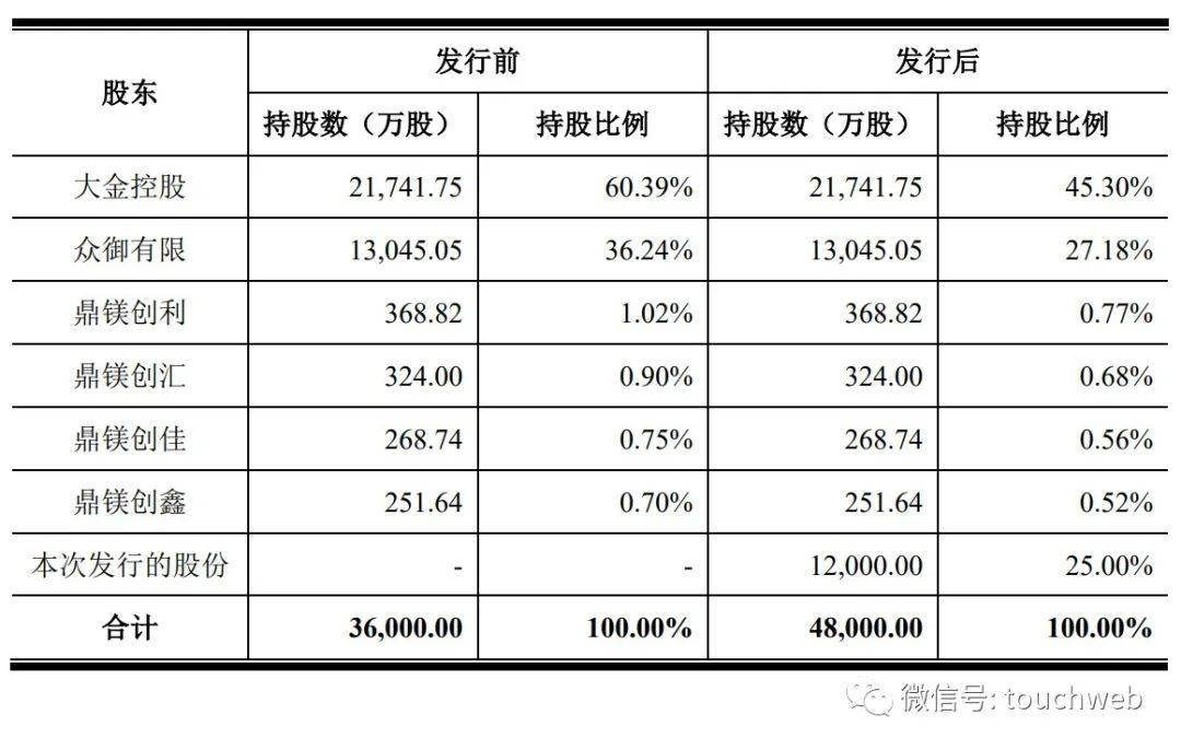 IPO后,大金控股持股45.3%,众御有限持股27.18%,鼎镁创利持股0.77%,鼎镁创汇持股0.68%,鼎镁创佳持股0.56%,鼎镁创鑫持股0.52%。