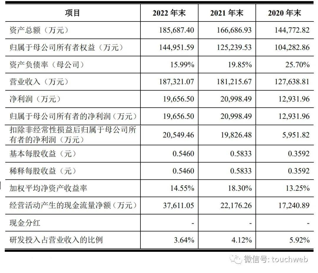 招股书显示,鼎镁科技2020年、2021年、2022年营收分别为12.76亿元、18.12亿元、18.73亿元;净利分别为1.29亿元、2.1亿元、1.97亿元;扣非后净利分别为5951.8万元、1.98亿元、2.05亿元。