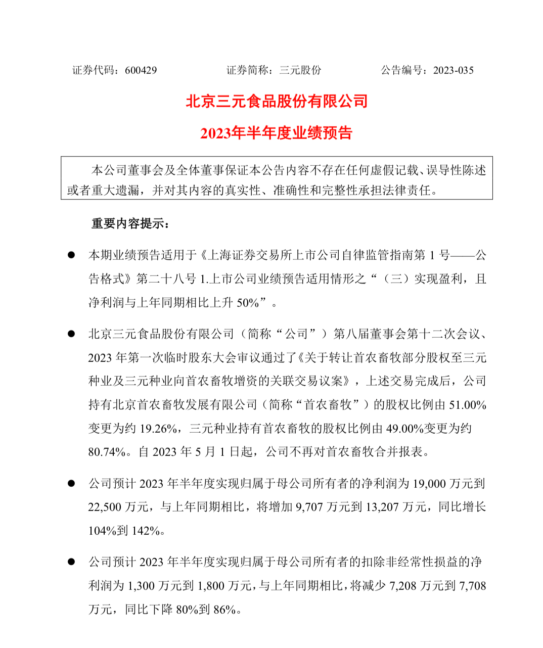 对于本期业绩变动的主要原因,在业绩报中谈到了一笔交易:公司于2023年5月转让首农畜牧部分股权,取得股权转让收益约1.9亿元,增加当期净利润;本次转让首农畜牧股权取得收益属于非经常性损益,不增加当期扣非后归母净利润。
