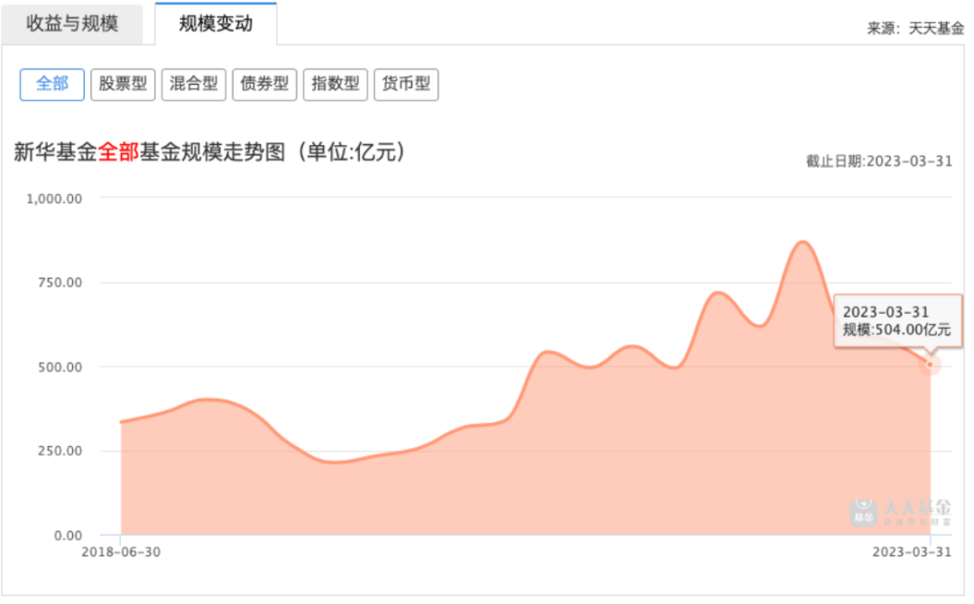 WIND数据显示,截至今年一季度末,新华基金的公募管理规模为504亿元,较去年年中的860多亿降幅超四成,在所有基金公司中排名第80。其中,非货规模有317.63亿元。从二级分类来看,股票型基金为19.25亿元、混合型基金101.28亿元、债券型基金196.71亿元。从单只产品的最新规模来看,新华基金旗下产品中有超40只产品(不同份额分开计算)规模不足2亿元,占比过半。
