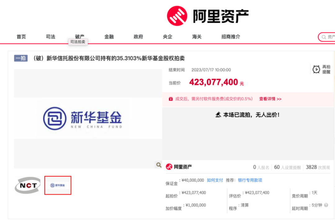 7月16日、17日,新华信托持有的35.3103%新华基金股权正式公开拍卖,最终以流拍收尾。