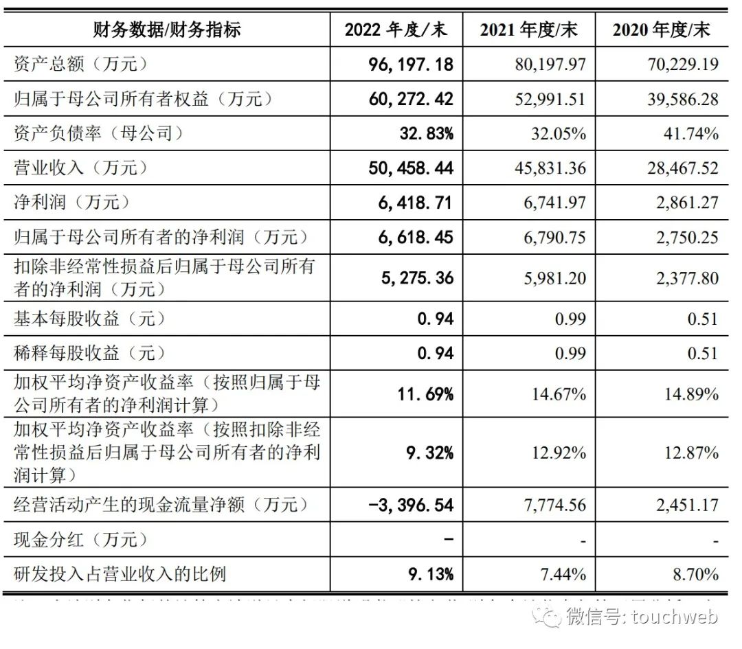招股书显示,精智达2020年、2021年、2022年营收分别为2.85亿元、4.58亿元、5.05亿元;净利分别为2861万元、6742万元、6419万元;扣非后净利分别为2377.8万元、5981.2万元、5275.36万元。
