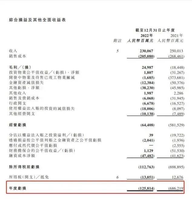 利润表方面,中国恒大在2021年和2022年连续亏损,亏损额分别为6862.2亿元和1258.1亿元,合计净亏损金额超8120亿元。