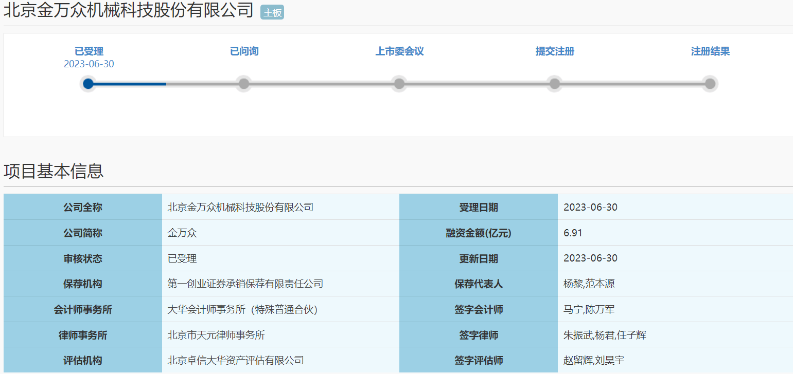 近日,北京金万众机械科技股份有限公司(下称“金万众”)主板IPO获上交所受理,本次拟募资6.91亿元。