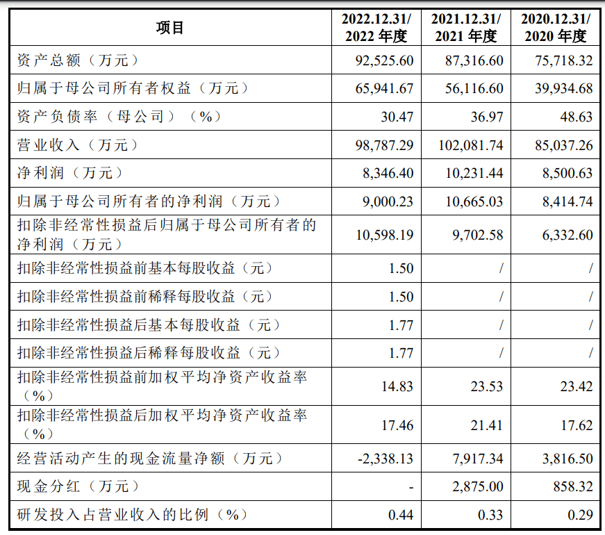 财务数据显示,公司2020年、2021年、2022年营收分别为8.5亿元、10.21亿元、9.88亿元;同期对应的归母净利润分别为8414.74万元、1.07亿元、9000.23万元。