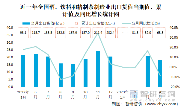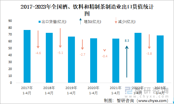 根据国家统计局数据可知:2023年4月全国酒、饮料和精制茶制造业出口货值为18.4亿元,同比下降8.4%;2023年1-4月全国酒、饮料和精制茶制造业累计出口货值为68.8亿元,累计同比下降0.2%;2017-2023年全国酒、饮料和精制茶制造业出口货值2017年1-4月达到最大值。