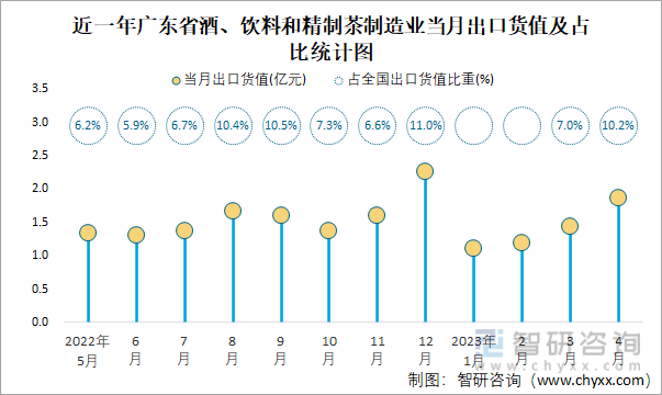 近一年广东省酒、饮料和精制茶制造业当月出口货值及占比统计图