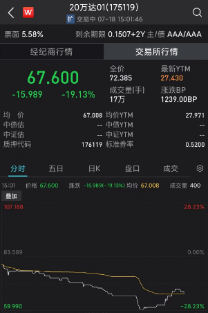 7月18日午后,“20万达01”交易异常波动,跌近21%,触发盘中临停,自13时26分起暂停交易,13时56分恢复交易后,价格继续下挫,一度跌超28%,随后略有收窄。