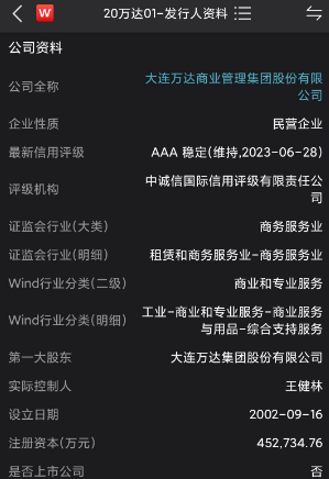 “20万达01”的发行人为大连万达商业管理集团股份有限公司((简称“万达商业”),而万达商业的大股东为大连万达集团,实际控制是王健林。