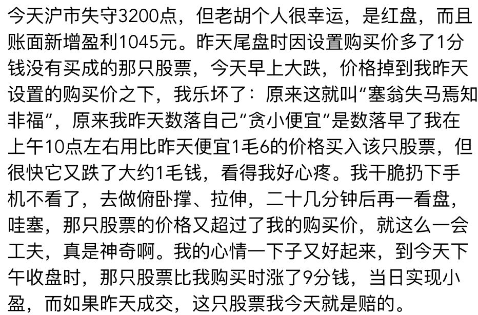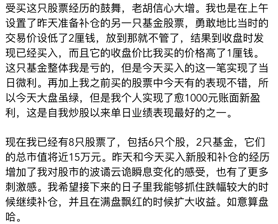 原标题:胡锡进:成功抄底加仓,虽然大盘绿了,但个人盈利赚了1000多,希望能继续在大跌的时候补仓