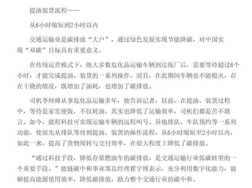 以交通能源行业的中游物流运输场景为例。在传统模式下,绝大多数油品运输车辆到达炼厂后,需等待超过6个小时,才能完成提油、装货的一系列操作。在此期间,车辆存在干烧情况,增加了油耗及相应碳排放。而能程科技基于数字化技术,可实现运输车辆的远程叫号、异地排队、车队预约等功能,将原来提油过程的等待时间缩短至2小时以内,大幅提高装货效率,减少车辆排队时未熄火干烧情况,进而降低碳排放。