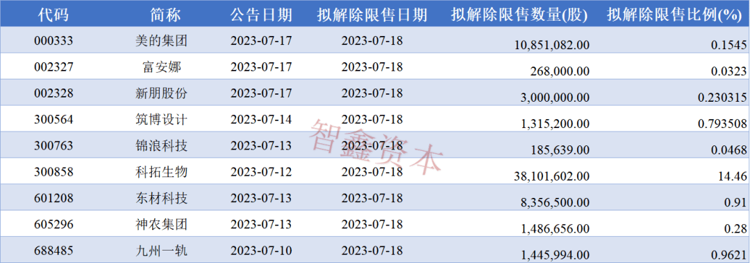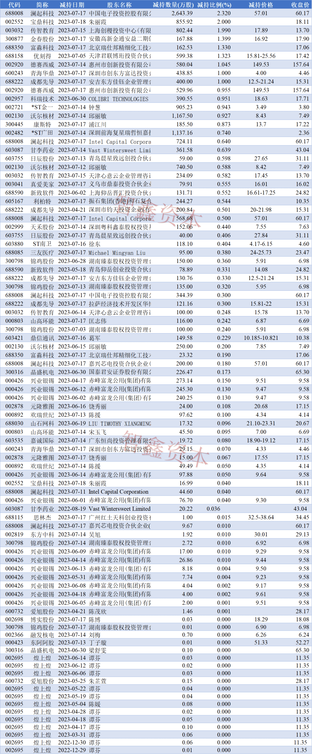 截至2023年7月18日17点,涉及股东减持的前五名上市公司分别为:澜起科技4534.84万股、沃尔核材2158万股、*ST广田1137.16万股、传智教育1136.53万股、德赛西威1110万股。