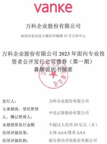 【大河财立方消息】7月18日,万科企业股份有限公司披露了2023年面向专业投资者公开发行公司债券(第一期)的相关发行文件。
