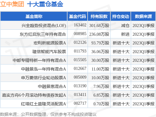 根据2023Q1季报公募基金重仓股数据,重仓该股的公募基金共10家,其中持有数量最多的公募基金为兴全趋势投资混合(LOF)。兴全趋势投资混合(LOF)目前规模为201.61亿元,最新净值0.6414(7月17日),较上一交易日下跌0.3%,近一年下跌8.81%。该公募基金现任基金经理为谢治宇 董理。谢治宇在任的基金产品包括:兴全合润混合(LOF),管理时间为2013年1月29日至今,期间收益率为531.61%;兴全合宜混合(LOF)A,管理时间为2018年1月23日至今,期间收益率为47.49%;兴全社会价值三年持有混合,管理时间为2019年12月26日至今,期间收益率为43.24%;董理在任的基金产品包括:兴全轻资产混合(LOF),管理时间为2017年11月23日至今,期间收益率为43.84%;