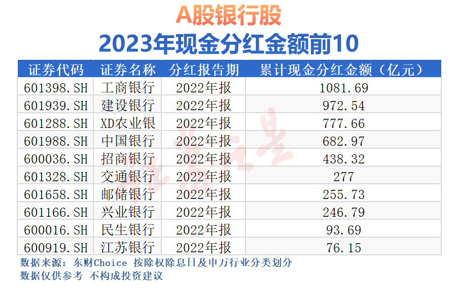 以当中分红力度最大的工商银行为例,年初至今累计现金分红接近1100亿元人民币,相当于2022年净利润的三成,其他多家银行的情况也是大致类似。