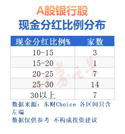 事实上,高比例现金分红在银行股当中并不罕见。同样是根据东财Choice的数据,上述32家年内有分红的上市银行当中,21家银行的现金分红比例(现金分红占对应报告期净利润的比例)在25%及以上,其中部分银行甚至达到30%。根据第一财经在报道银行分红问题时引用的业内人士说法,近几年来国有大行的分红比例基本都维持在30%以上,部分股份行、城商行也将分红比例30%写入公司章程,一方面是因为考虑到股东回报、长期价值增长等多方面因素,另一方面也是银行自身对未来经营具备信心。