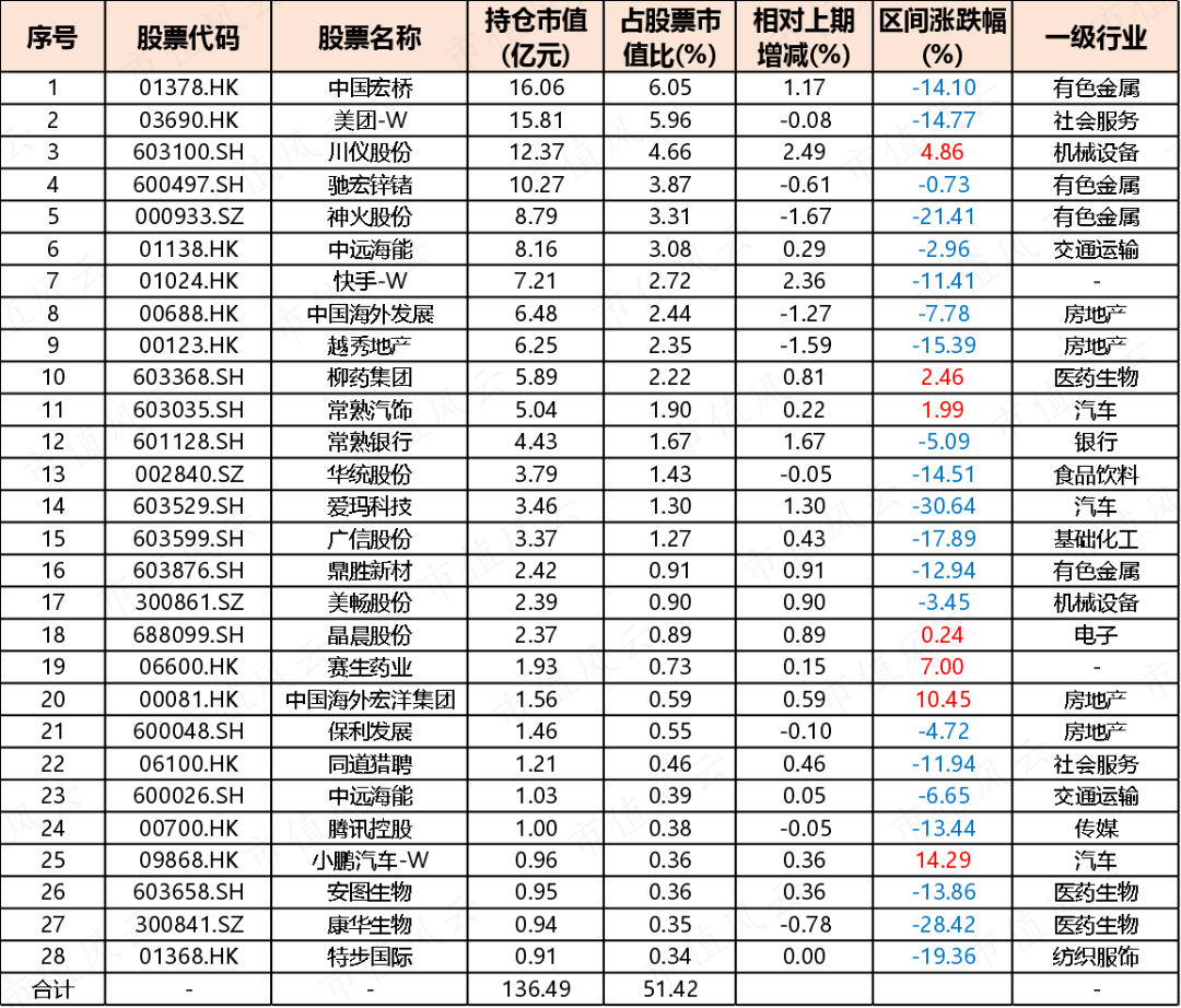 此外,资源股遭到抛弃,中海油、广汇能源、兖矿能源被清仓,神火股份、下降至第6大重仓股。