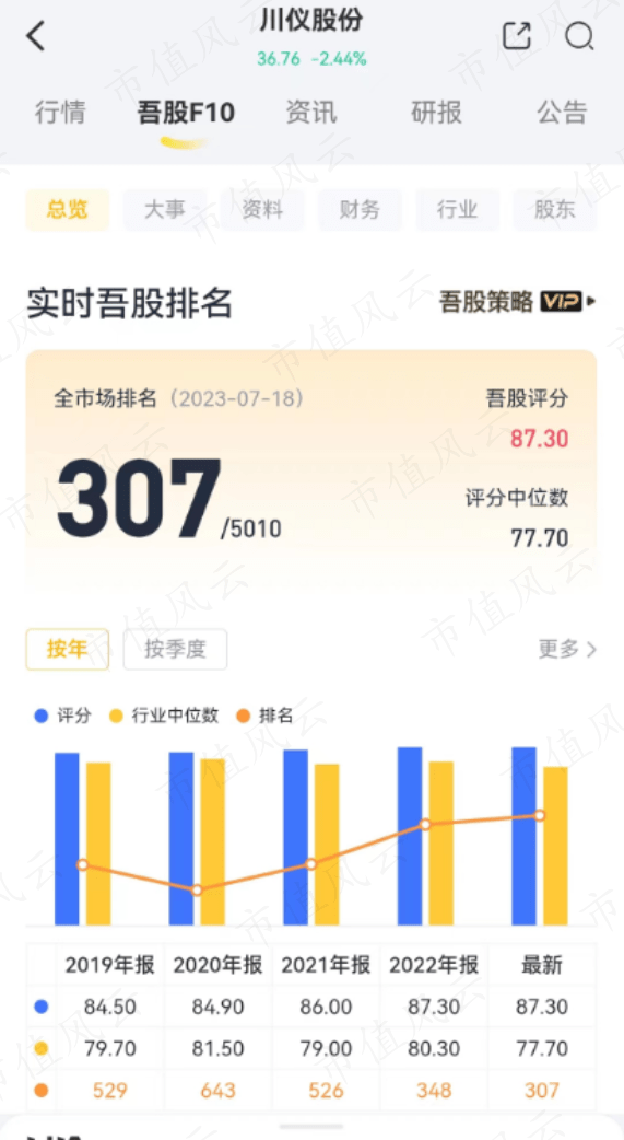 川仪股份的主营业务是工业自动控制系统装置及工程成套,目前已经公布了上半年的业绩快报,营收和归母净利润分别为36亿和3.48亿,同比增长18%和37.1%。而市值风云APP“吾股”评级的排名也逐年升高。