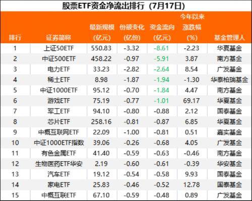 从资金净流出情况看,7月17日当天,资金净流出前15只股票ETF中,有11只为行业主题ETF。