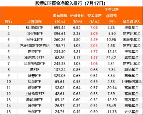 从资金净流入排行看,7月17日当天收盘,科创50ETF、创业板ETF等宽基指数,以及半导体ETF、医疗ETF、酒ETF、证券ETF等行业指数产品受到资金青睐,资金净流入排行居前。