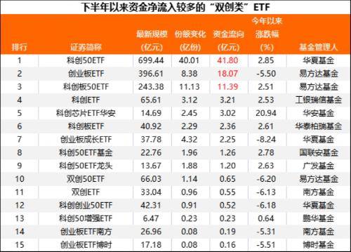 创业板ETF下半年以来获得18.07亿元的资金净申购。此外,科创板50ETF、科创ETF、科创芯片ETF净流入资金也比较多。