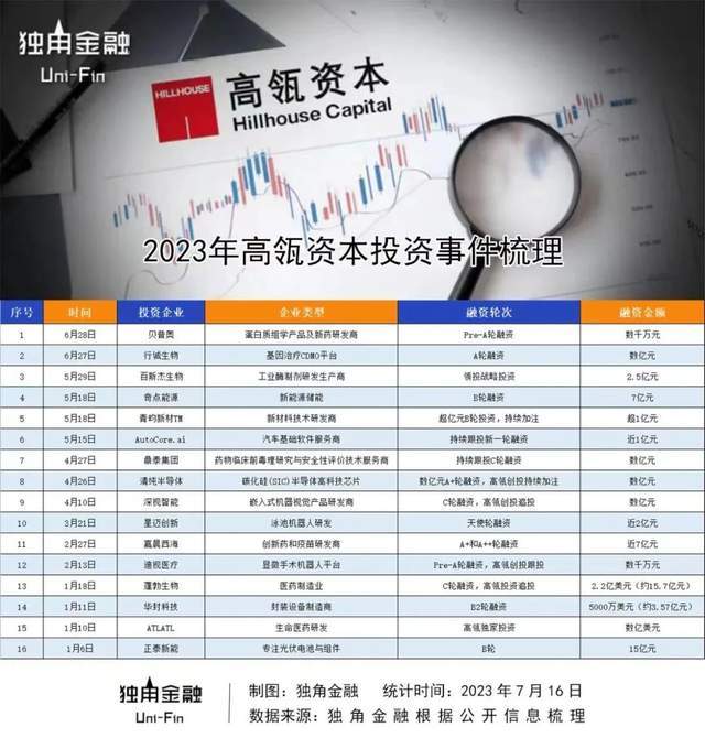 据独角金融不完全统计,截至2023年6月底,高瓴资本共发生了16笔投资,其中近50%都与高端制造业有关,且大多为一级市场投资。例如,5月18日青昀新材宣布完成超亿元B轮投资,A轮领投方高瓴资本旗下高瓴创投持续加注。