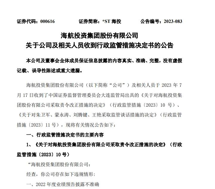 *ST海投18日盘后公告,公司及相关人员于7月17日收到了大连证监局出具的《关于对海航投资集团股份有限公司采取责令改正措施的决定》(行政监管措施〔2023〕10号)、《关于对朱卫军、蒙永涛、刘腾键、王艳采取监管谈话措施的决定》(行政监管措施〔2023〕11号)。