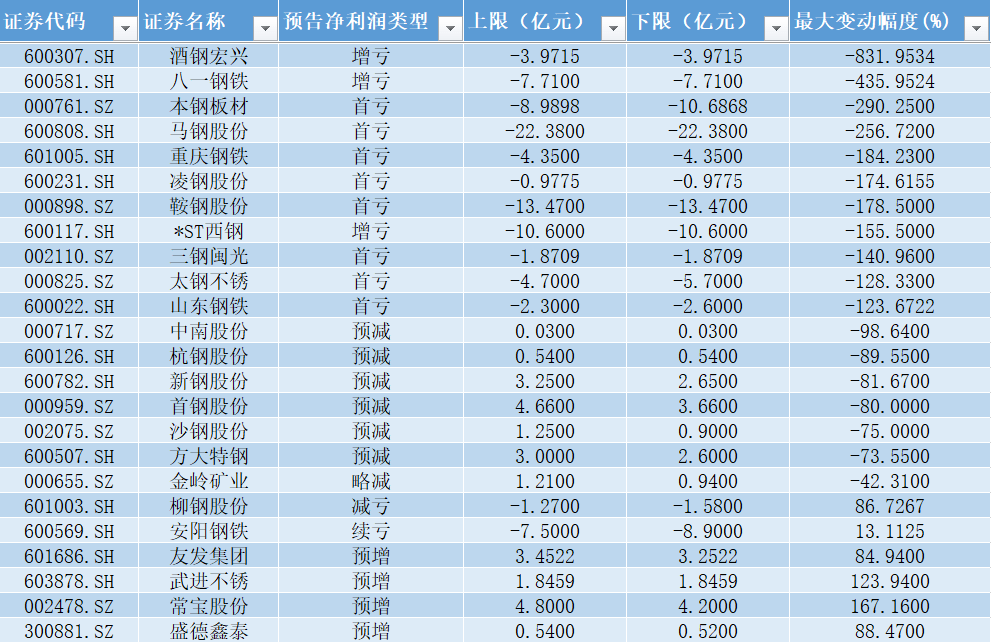 24家披露业绩预告的上市钢企预计上半年业绩情况。数据来源:Choice;制表:时代财经