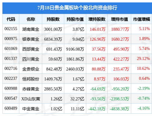 北向资金方面,当日贵金属板块北向资金持股市值为63.57亿元,减持0.34亿元。其中增持最多的是湖南黄金,增持了0.19亿元。减持持最多的是中金黄金,减持了0.48亿元。贵金属板块北向资金持股变动明细见下表: