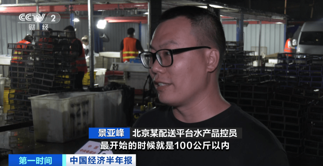 北京某配送平台水产品控员景亚峰:现在冷链物流车特别多,一些新品类6月初开始上的量,最开始的时候就是一百公斤以内,现在我们周六日能够达到六七百公斤,销量已经是很大了。