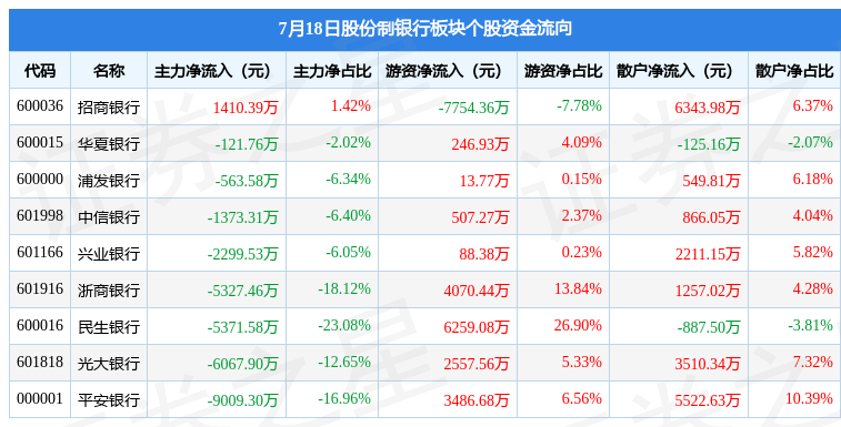 从资金流向上来看,当日股份制银行板块主力资金净流出2.87亿元,游资资金净流入9475.74万元,散户资金净流入1.92亿元。股份制银行板块个股资金流向见下表: