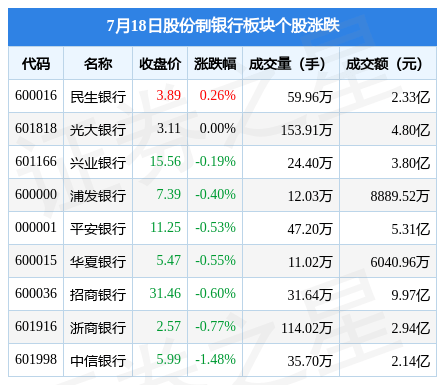 7月18日股份制银行板块较上一交易日下跌0.5%,中信银行领跌。当日上证指数报收于3197.82,下跌0.37%。深证成指报收于10972.96,下跌0.34%。股份制银行板块个股涨跌见下表: