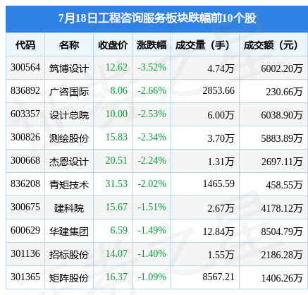 7月18日工程咨询服务板块较上一交易日下跌0.32%,筑博设计领跌。当日上证指数报收于3197.82,下跌0.37%。深证成指报收于10972.96,下跌0.34%。工程咨询服务板块个股涨跌见下表: