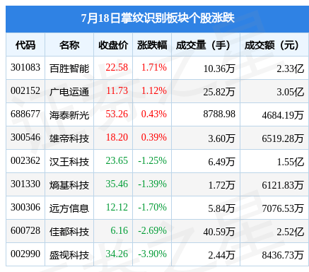 7月18日掌纹识别板块较上一交易日下跌0.38%,盛视科技领跌。当日上证指数报收于3197.82,下跌0.37%。深证成指报收于10972.96,下跌0.34%。掌纹识别板块个股涨跌见下表: