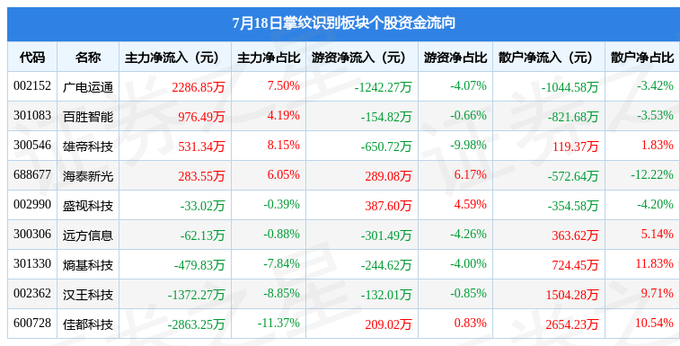 从资金流向上来看,当日掌纹识别板块主力资金净流出732.27万元,游资资金净流出1840.21万元,散户资金净流入2572.48万元。掌纹识别板块个股资金流向见下表: