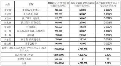 本次共有612名激励对象符合解除限售条件,可解除限售的限制性股票数量为4,328,702股(以中国证券登记结算有限责任公司上海分公司实际登记数量为准),占目前公司总股本的0.32%,具体如下: