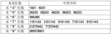 凡参与本次网上定价发行申购君逸数码A股股票的投资者持有的申购配号尾数与上述号码相同的,则为中签号码。中签号码共有27,396个,每个中签号码只能认购500股君逸数码A股股票。