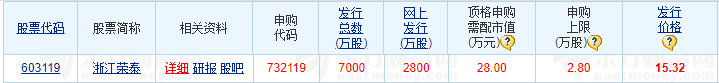7月19日,新股打新市场迎来浙江荣泰(603119)在沪市主板的发行申购。它在网上发行2800万股,顶格申购需配沪市股票市值28万元。