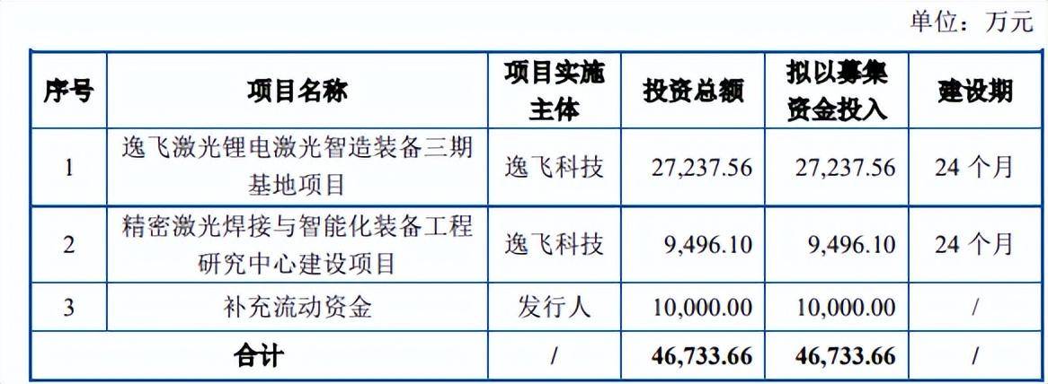 按照发行计划,逸飞激光原募集资金4.67亿元,拟用于逸飞激光锂电激光智造装备三期基地项目、精密激光焊接与智能化装备工程研究中心建设项目和补充流动资金。