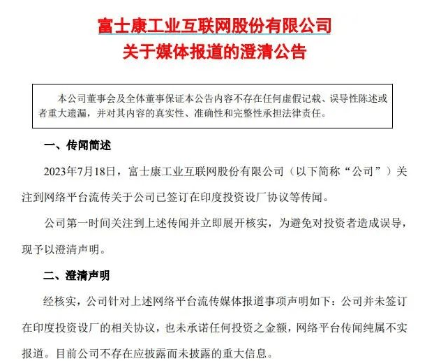 7月18日,工业富联发布关于媒体报道的澄清公告,公司关注到网络平台流传关于公司已签订在印度投资设厂协议等传闻。经核实,公司针对上述网络平台流传媒体报道事项声明如下:公司并未签订在印度投资设厂的相关协议,也未承诺任何投资之金额,网络平台传闻纯属不实报道。目前公司不存在应披露而未披露的重大信息。