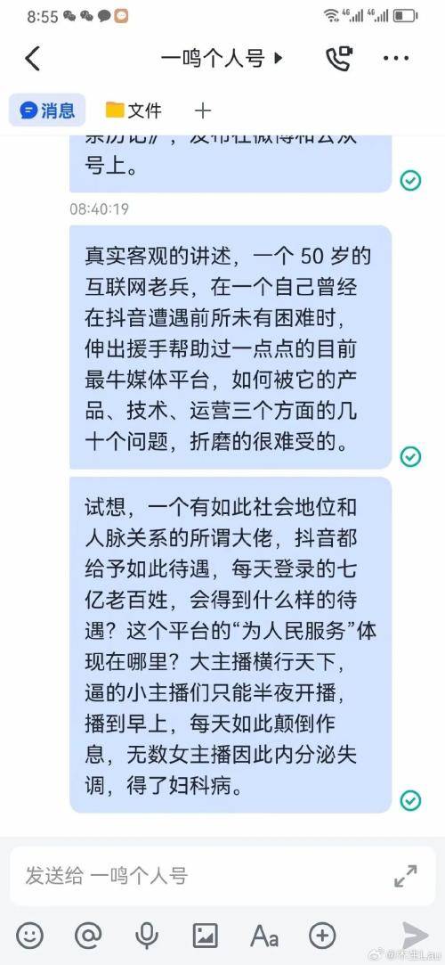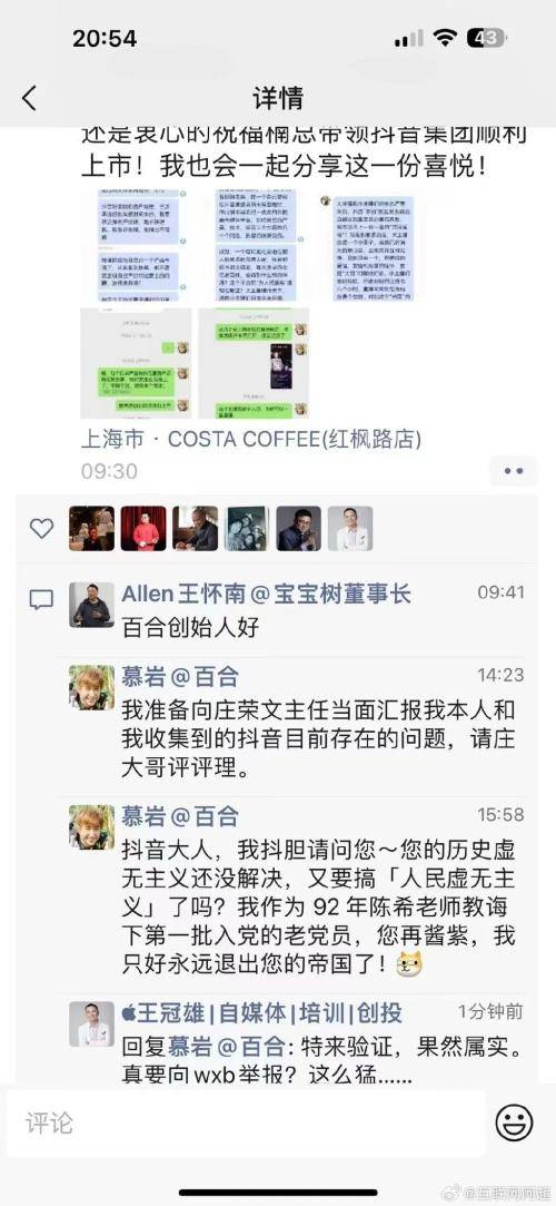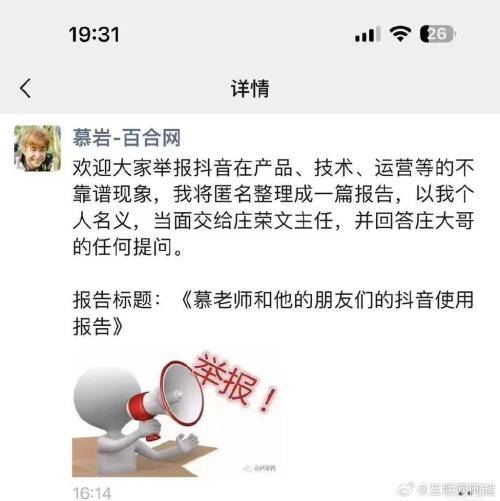 慕岩通过飞书向张一鸣、张楠等字节高管提出了对抖音产品使用过程中的问题反馈,均未收到任何答复和反馈。一怒之下,声称要和官媒沟通写一篇特稿《百合创始人的抖音亲历记》,且要发表在微博和公众号上。