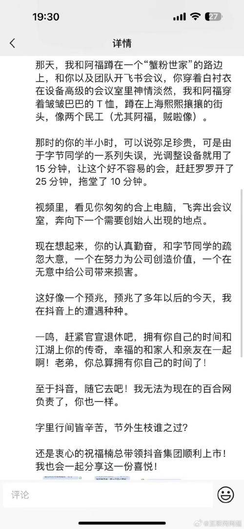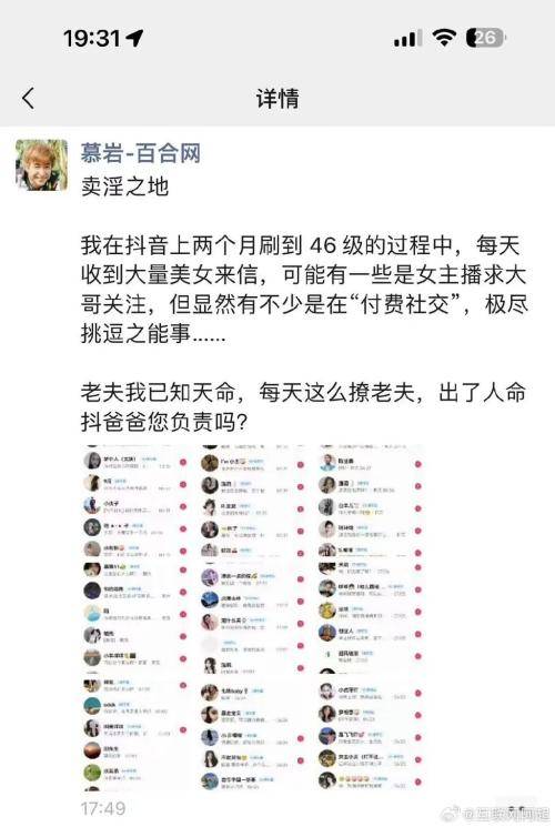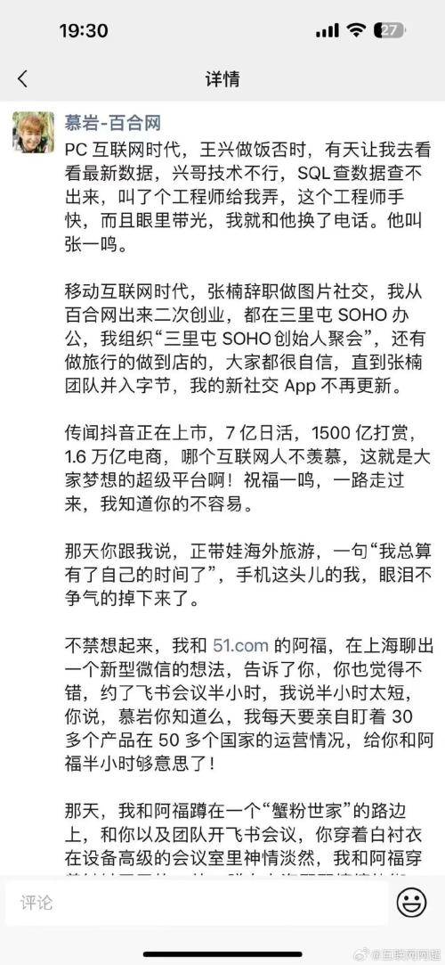 百合网创始人慕岩今天公开“呛”老友字节跳动掌舵人张一鸣了。