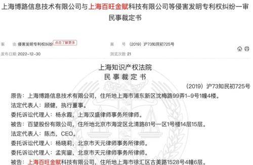 中国裁判文书网显示,2020年3月12日,上海博路信息技术有限公司(以下简称“博路信息”)作为原告,将百望股份以及上海百旺金赋科技有限公司(以下简称“百望金赋”)因侵害发明专利告上法庭。