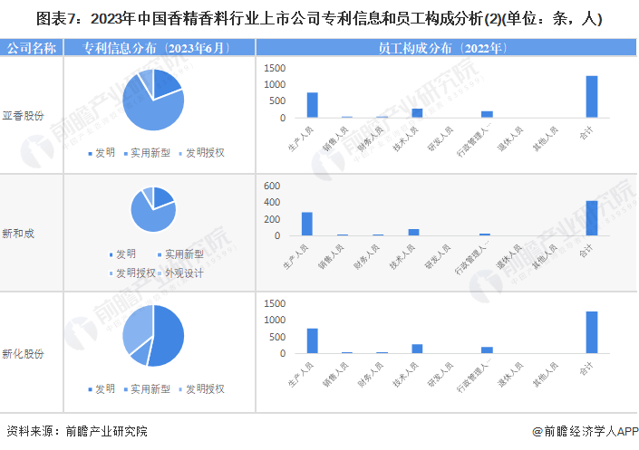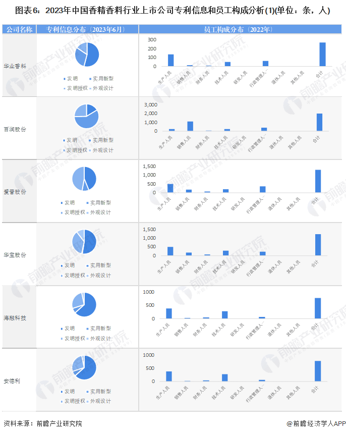 从香精香料行业的上市企业已有的公开信息分析,专利信息相对较多的企业是新和成,专利总计530条;员工总数最多的也是新和成,员工总数为11526人;技术人员相对最多的同样是新和成,技术人员总数为2629人。