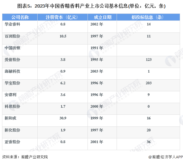 从香精香料行业的上市企业布局和已有公开信息分析,注册资本最多的是新和成,达到30亿元;成立时间最早的是中国波顿,成立于1991年;招投标信息最多的是华宝股份,达到203条。
